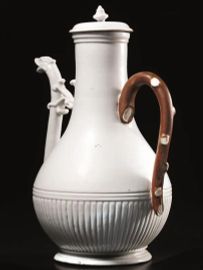 in porcellana bianca parzialmente dipinta in marrone. Corpo piriforme scandito nella parte inferiore da sottile baccellatura, tipico beccuccio modellato all’estremità a testa di serpente, manico reso ad imitare un rametto nodoso dipinto in marrone; coperchio convesso con presa a trottola, alt. cm 29, danni alla presa del coperchio