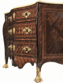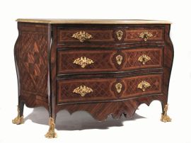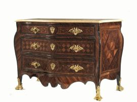 becco di civetta, fronte e fianchi mossi, tre cassetti intarsiati con