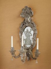 in vetro a tre luci, cornice sagomata sormontata da cimasa aperta in una palmetta centrata da mascherone, vetro decorato con figure, cm 80x43, rifacimenti (2)