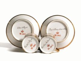 in porcellana dipinta in policromia e oro, raffiguranti vedute napoletane. Dietro un piattino iscrizione Veduta di Pozzuoli, sotto una tazza la scritta Camaldoli di Pozzuoli; dietro l’altro piattino iscrizione Tempio di Diana e Castello di Baia, sotto l’altra tazza la scritta Real Casino del Fusaro. Marca N coronata in azzurro e corona con iscrizione N. 1813 in rosso su ciascun pezzo, numero 40 inciso nella pasta delle due tazzine (4)