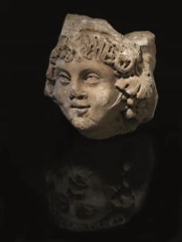 La testa raffigura un giovane putto volto a destra, lo sguardo verso l’alto, i capelli ricciuti, che scendono in boccoli scompigliati sulla fronte, realizzati con abbondante uso di trapano, sono frammisti a pampini e grappoli d’uva sopra le orecchie; la fronte è ampia, le arcate orbitali fortemente chiaroscurate, gli occhi a mandorla con indicazioni delle palpebre, del dotto lacrimale e della pupilla con l’iride, il naso è piccolo, gli zigomi rilevati; la bocca è socchiusa, il mento pronunciato.