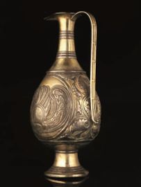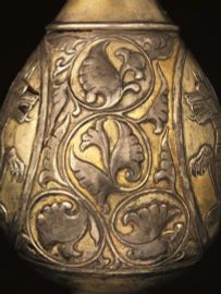 Decorazione: sul collo e sul piede due gruppi di anelli plastici orizzontali in argento naturale, corpo interamente decorato a sbalzo con due medaglioni circolari raffiguranti il Senmurv, cane-pavone della mitologia iranica alternati a girali e volute floreali e fitomorfe. L’apparato decorativo è interamente giocato sull’alternanza cromatica tra le parti in argento naturale e quelle dorate.