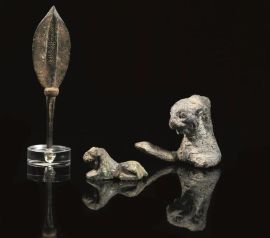 Un’ascia con lama arcuata in ferro e immanicatura a cannone con testa di divinità barbata; lunga lama seghettata con tre fori a una estremità per l’impugnatura oggi mancante, piccola punta di freccia foliata con costolatura decorata su entrambi i lati con incisioni geometriche; una piccola statuetta di leone accosciato stilizzato ed una protome di leone ruggente veridicamente reso privo della zampa sinistra (5)