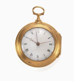 OROLOGIO DA TASCA A DOPPIO QUADRANTE CON CALENDARIO SOLARE E LUNARE, WILLIAM PYBUS, LONDON 1790 CIRCA, IN OTTONE DORATO