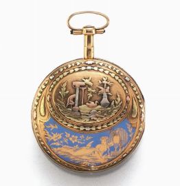 Cassa in oro rosa con riserva ovale cesellata a paesaggio architettonico in oro dei tre colori, nella parte inferiore decorazione in oro e smalto azzurro raffigurante fanciulla distesa su un prato fra volute di fiori e fogliue e vaso con fiori. Quadrante firmato in smalto bianco con numeri arabi, apertura per la chiavetta tra ore 1 e 2, lancette traforate. Movimento con scappamento a verga, carica e rimessa delle ore a chiavetta. Diam. mm 47