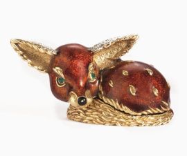 modellato come una volpe in oro e smalto rosso, occhi in smeraldo e orecchie impreziosite da brillanti, punzoni FC Modele Depose 347 AL 18 K made in Italy; all'interno piccolo orologio Burmid, g 52 lordi