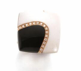ciascun orecchino realizzato da un cabochon orotndo in onice nera a cui sono sospesi anelli in oro rosa, onice bianca e onice nera; l'anello, en suite, di forma quadrata in onice bianca e nera, decorata da una linea in brillanti, punzone 750, g 37