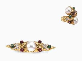 Parure in oro giallo, perle mabe, smeraldi, rubini e diamanti composta di