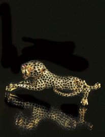 modellata come un leopardo in oro giallo con macchie in smalto nero, occhi, naso, bocca e orecchie in smalto rosso, punzoni 750 e 485 AL, g 26