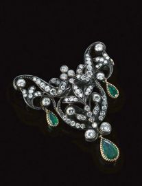 SPILLA PENDENTE IN ARGENTO, ORO GIALLO, SMERALDI E DIAMANTI