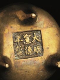 in bronzo dorato, poggianti su tre piedi con maniglie a cinghia, recanti sul fondo marchio a sei caratteri Xuande apocrifo, diam. cm 7 (2)