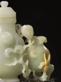 in giada bianca con lievi inclusioni color ruggine, modellato nella forma di un contenitore con al fianco un piccolo vaso ad anfora entrambi avvolti da racemi foriti, alt. cm 12,5, poggiante su base in legno lavorata