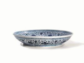 A Ming-style blue and white "Lotus Bouquet" porcelain dish, Qing Dynasty, 18th century