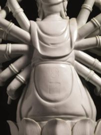 in porcellana Dehua, raffigurante Guanyin dalle molte braccia reggenti attributi assisa in dhyanasana su base a fior di loto, alt. cm 39, poggiante su base in legno, recante marchio a doppia zucca Dehua, e un sigillo squadrato sottostante con scritta He Chaozong zhi