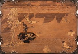 in legno di noce con intarsi in legno di frutto a raffigurare una natura morta con vasi e fiori; due piani di forma sagomata riccamente intarsiati, quello inferiore più grande e completo di due maniglie laterali in bronzo, gambe sagomate scolpite con scanalature e motivi vegetali a rilievo. Un esemplare simile è conservato al Museé d’Orsay. Firma Gallé sul piano, cm 88x103x66