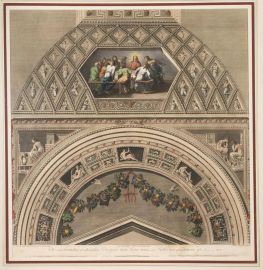 Serie completa ed omogenea di 13 bulini finemente acquerellati a mano, più una tavola doppia (Raphael, 33), pubblicate a Roma nel 1776. Dalle decorazioni Raffaello nelle Logge Vaticane tradotte in disegno per l’incisione da Gaetano Savorelli e Pietro Camporesi.