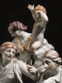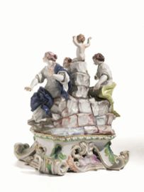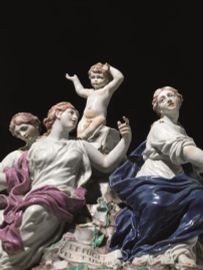 Sia le figure delle Parche che il putto, si ritrovano, in bianco, come elementi dell’imponente Tempietto donato da Carlo Ginori all’Accademia Etrusca di Cortona e realizzato dalla Manifattura tra il 1750 e il 1756 (Rita Balleri, Il Tempietto Ginori dell’Accademia Etrusca di Cortona: una rilettura, in Laura Casprini Gentile e Dora Liscia Bemporad, Artisti per Doccia, Firenze 2009, pp. 7-21). Il gruppo qui presentato, come suggerisce l’impostazione frontale, era destinato ad essere esposto come scultura da tavolo in gallerie o altri ambienti di rappresentanza. Questa categoria di gruppi plastici è descritta nella “Tariffa dei prezzi delle porcellane della fabbrica di Doccia” del 1760 circa (Leonardo Ginori Lisci, La porcellana di Doccia, Firenze 1963, p. 235) sotto la voce “Robe diverse da Camera o da Galleria” dove si precisa, come è stato già notato da Luca Melegati che, qualora dipinti, questi pezzi “si vendono il doppio”. Il costo elevato spiega la rarità di gruppi policromi di queste dimensioni nella produzione di Doccia a noi nota. La cromìa e il gusto rococò della base fanno propendere per una datazione approssimativa tra il 1755 e il 1770.
