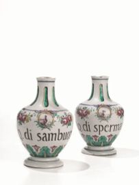in maiolica dipinta in policromia a piccolo fuoco con porpora, verde, blu, giallo, bruno di manganese nei toni del nero e del viola. L’albarello a rocchetto e le due fiasche con corpo ovoidale portano al centro della decorazione un emblema, forse di proprietà, costituito da una veduta con ponte e torretta entro medaglione, trattenuto da raffinate ghirlande floreali sulla spalla dell’invaso, mentre una sequenza di foglie d’acanto alternate a fiori campaniformi delimita il fondo. Al centro è tracciata l’iscrizione apotecaria in manganese.