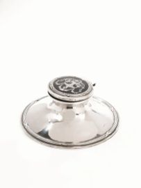 di forma circolare, in argento con coperchio decorato a volute, base appesantita