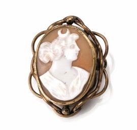 una spilla con cammeo ovale raffigurante mezzo busto di Diana entro cornice