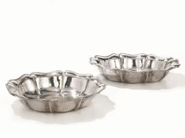 in argento rispettivamente di forma circolare ed ovale con profili sagomati, cm 26,5 e diam. cm 25, complessivi g 600 ed
