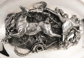 in argento di forma ovale, bordo a cordonetto, due anse modellate come valve di conchiglia, coperchio con finale a trofeo di caccia, cm 43x24, g 1800
