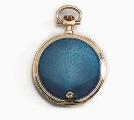 Cassa decorata in smalti guilloche azzurro e bianco con piccolo diamante, carrure in oro inciso a righe, lunetta analogamente decorata in smalto, corona di carica a ore 12. Quadrante bicolore argentè e oro con numeri arabi Breguet, lancette a foglia e piriformi, secondi a ore 6. Movimento firmato a carica manuale. Diam. mm 45.5