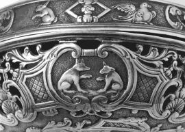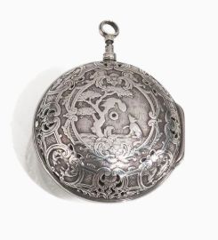 Cassa in argento traforato e cesellato a volute formanti riserve entro cui sono raffiguranti coppie di animali e palmette, al centro riserva circolare entro cui è cesellato un paesaggio con animali. Quadrante cesellato con cartouches in smalto bianco con ore in numeri romani e minuti in numeri arabi, parte centrale cesellata a raffigurare un gatto su volute, lancette traforate, alloggio per la chiavetta a ore 4. Movimento con scappamento a verga, ripetizione delle ore e dei quarti. Diam. mm 53