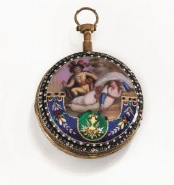 Cassa in ottone decorata da miniatura policroma raffigurante scena galante e decorazioni floreali in smalto traslucido, lunette posteriore e anteriore in rose di diamante. Quadrante in smalto bianco con numeri arabi, lancette traforate decorate da rose di diamante, alloggio per la chiavetta di carica a ore 2. Movimento con scappamento a verga, carica e rimessa delle ore a chiavetta. Diam. mm 50