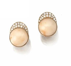 Paio di orecchini oro giallo, corniola, coralli mabe' salmone e peau d'ange e diamanti