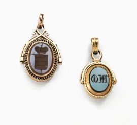 due pendenti di forma ovale in oro giallo e oro rosa con sigilli in pietre dure; due pendenti portaricordi di cui uno decorato da un micromosaico e l'altro da un'ametista ovale; un pendente realizzato a forma ovale intrecciata in oro cesellato con granati cabochon ed una spilla pendente con corolla in granato, ametiste e perle entro anello bombato in oro giallo cesellato, g 77