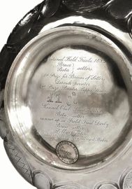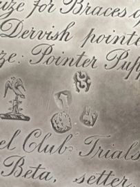 On the bases engraved: National Field Trials 1885. Bruce Beta Setters. 1 Prize for Braces of Setters. Dervish pointer. 2 Prize: Pointer Puppy Stakes. Kennel Club Trials 1885. Beta, setter, runner up in Field Trial Derby. Bruce, setter Polly, pointer divided 1 and 2 prizes in all aged Stakes and a paper label Collection S. Bulgari Rome.