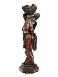 in legno scolpito ed ebanizzato con inserti in avorio dipinto, modellato a figura negroide con folti capelli ricciuti, nudo ad eccezione di una pelle di leone drappeggiata sulle spalle e annodata in vita, in atto di sostenere una conchiglia, su base modanata esagonale sostenuta da tre tartarughe, altezza complessiva cm 202, piccoli danni