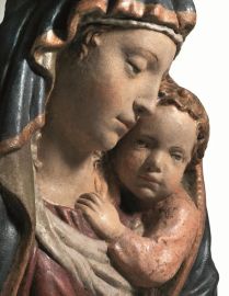 Questi rilievi, sovente foggiati a calco sia in argilla che in stucco - come appunto l’esemplare in esame - secondo un procedimento assai diffuso nelle botteghe dei principali scultori fiorentini adatto a soddisfare le diverse esigenze di un vastissimo mercato che si estendeva ben oltre i confini della Toscana, interessato ad acquistare versioni più accessibili di modelli particolarmente apprezzati e venerati, erano nobilitati e differenziati da variegate policromie affidate a pittori specializzati, come Bicci di Lorenzo ed il figlio Neri: vere e proprie “pitture a rilievo” (Gentilini 2012), espressione del serrato “dialogo” tra le arti affermatosi in quegli anni a Firenze e testimonianza emblematica del primato artistico e commerciale di questa città (Mozzati 2013). Così anche nell’esemplare in esame è proprio la sensibile policromia, rimessa in luce da un recente, accurato restauro condotto da Chiara Piani (studio I Bastioni, Firenze, 2013-2014), che contribuisce non poco a qualificare l’immagine e persino a definire il risalto plastico, conferendo morbidezza e nobiltà agli incarnati di una delicata tonalità perlacea, vivacità ai guizzanti riccioli lumeggiati del Fanciullo, e una preziosa sostanza serica ai tessuti, dove si apprezzano in particolare la nuance rosso cremisi della veste di Maria e quella verde oliva del rovescio del manto, blu ardesia bordato d’oro.