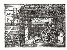 La decorazione istoriata vede la scena maggiore, dipinta nel cavetto, svolgersi all’aperto, in un giardino, sotto un’ampia tettoia verde posta in un campo pratoso con un villaggio sullo sfondo. Vi è raffigurata una giovane donna nuda, con un panneggio aranciato che le copre il pube, seduta al centro di un’ampia fontana semicircolare. Un uomo anziano sta dietro di lei, vicino, e le avvinghia il corpo, spingendole il mento per voltarle la testa verso un’altra figura maschile, che, in secondo piano, pare nascondersi dietro un esile tronco. L’orlo del cavetto è profilato con un sottile motivo a ovuli azzurri su fondo aranciato.