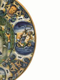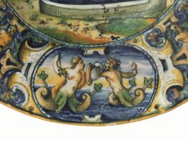 Pochi sono i pezzi di Mastro Domenico firmati e datati e di alta qualità formale considerati oggi opera diretta dell’artista (meno di una decina). Ma l’impostazione dell’ornato del nostro piatto, con il cavetto abitato da una scena istoriata e la tesa dominata da quattro scene minori in ovali con la cornice a cartelle, è totalmente coerente con i tre pezzi più noti firmati da Mastro Domenico e datati 1568: due sono conservati all’Herzog Anton Ulrich - Museum di Braunschweig e uno al Museo Internazionale delle Ceramica di Faenza.