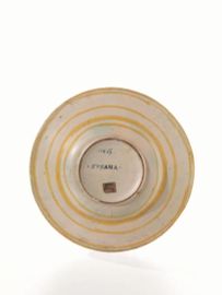 Il verso reca un sottile strato di smalto, che assume un tono beigiato, con poche grosse pulci e, sul retro della balza, leggeri aloni verdastri. L’anello d’appoggio è sottile e cilindrico. Sei filetti gialli profilano e decorano la tesa. Il fondo del piede smaltato presenta la data e l’iscrizione in blu.