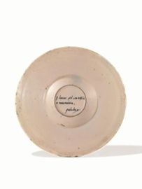Anche quest’opera, come già detto per il lotto 38, va accostata a quelle prodotte prima dell’arrivo dell’Avelli a Urbino e si aggiunge alla serie cosiddetta Y/φ, quindi al periodo anteriore al 1530. Dal confronto stilistico con altre sue opere possiamo comunque assegnare il piatto a un periodo già maturo, in cui egli aveva ormai affinato la sua tecnica e produceva scene dallo stile ormai fortemente caratterizzato. La vicinanza con il piatto firmato presentato al lotto 39 di questa vendita è evidente: l’uso dei colori ricchi – l’arancio, il violaceo e il verde molto carico – è ormai quello caratteristico del pittore rovigino. Ci conforta il paragone tra alcuni dettagli dell’oggetto in esame e particolari simili presenti in altre opere: si confrontino, per esempio, il paesaggio del nostro piatto con quello presente sul piatto con l’Allegoria del Tempo del City Council Museum di Glasgow, o anche il modo di rappresentare l’ombra del fornice del molo nella nostra opera e in una coppa con San Geronimo e il Beato Colombini in preghiera, anch’essa al museo di Glasgow, databile al 1528-1530.