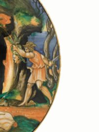 Ma è soprattutto la modalità nel dipingere le figure che ci aiuta nella datazione dell’opera. Il corpo di Medusa mostra lo stesso raffinato stile pittorico di quello già citato, presentato al lotto 39, ed è probabilmente tratto dalla stessa incisione spesso utilizzata dal pittore, ma anche di quello visibile nel piatto firmato “F.X.A.R. i(n) Urbino 1531” con Allegoria della buona e della cattiva Fama. Il fanciullo al centro del piatto torna in numerose altre opere, come nell’imponente piatto con Diana e Atteone dell’Ashmolean Museum di Oxford, oppure – con forma mutata – nel personaggio seduto che si appoggia a uno scudo, sulla tesa, a sinistra, nel grande piatto con il Matrimonio di Nono e Semiramide del Victoria and Albert Museum di Londra datato 1533.