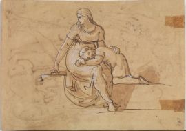 Al verso: Madre con bimbo dormiente. Penna e inchiostro bruno e rialzi a tempera bianca.