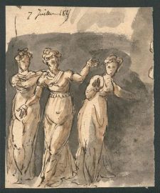 Studio di tre figure femminili in abiti neoclassici. Penna e inchiostro bruno e acquerello grigio su carta vergellata. mm 130x107.