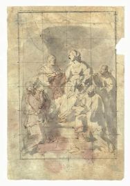 Adorazione della Vergine. Penna e inchiostro bruno e acquerello grigio quadrettato a matita di grafite. mm 172x116.