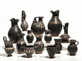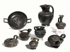 kylix ed unoinochoe trilobata; la ceramica a vernice nera mostra esempi di
