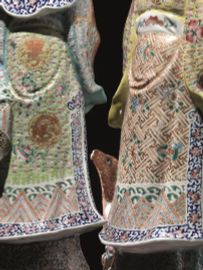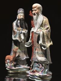 Due figure Cina sec. XIX-XX, in porcellana policroma, raffiguranti saggi con cerbiatto e volatile, alt cm 39