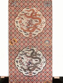 Lunga striscia di tessuto, Cina sec. XX, in seta ricamata con draghi entro riserve sagomate cm 450x53