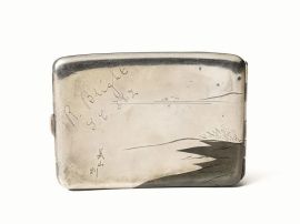 Porta sigarette Giappone sec. XX , in argento sterling decorato con motivo di paesaggio, firmato sul retro