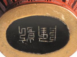 Snuff bottle, Cina sec. XIX, in lacca rossa, finemente decorata con  personaggi in un giardino di palazzo, marcata alla base Qianlong, alt. cm 8,4