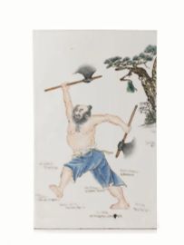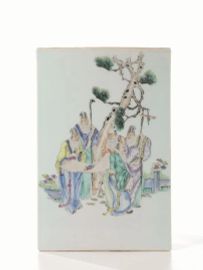 Tre placche, Cina Periodo Repubblicano, in porcellana, dipinte in policromia e raffiguranti scene animate, cm 47x18.6, cm 38.7x25.7, cm 42.5x 26.5 (3)