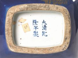 Vaso Cina sec. XVIII - XIX, di forma arcaica, in porcellana a fondo blu con decori di volatili tra rami fioriti in oro, reca marchio Qianlong, alt. cm 30, poggiante su base in legno