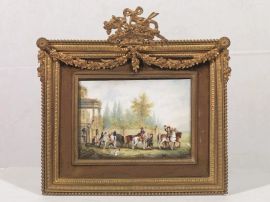 Due miniature su avorio, sec. XIX, raffiguranti rispettivamente "La partenza per la caccia" e "La sosta della caccia", entro cornici in bronzo dorato, cm 23x22,5 (2)